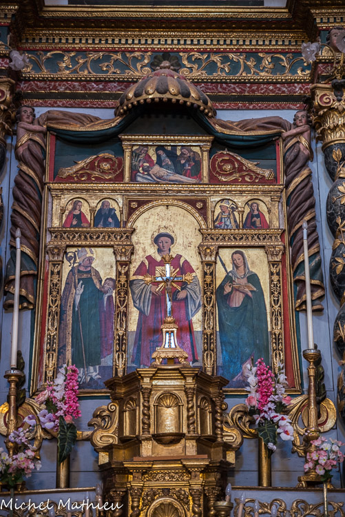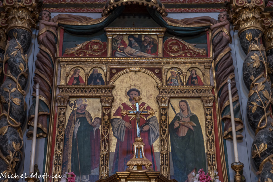 Roure. Le polyptyque, au-dessus du maître-autel, montre, dans son panneau central, St Laurent, portant la dalmatique, l’habit liturgique des diacres, avec son attribut, un gril. Né en Espagne (ou à Rome ?), archidiacre du pape St Sixte II et chargé des biens de l’Eglise, il est, selon la légende, supplicié sur un gril pour lui faire livrer les Livres Saints et les richesses dont il avait la garde mais qu’il avait distribuées aux pauvres sur ordre du pape. A ce double titre, il est considéré comme le patron des pauvres et des archivistes, Il fut l’un des martyrs les plus populaires de la chrétienté. Il est réputé guérir les brûlures et prévenir les incendies.
