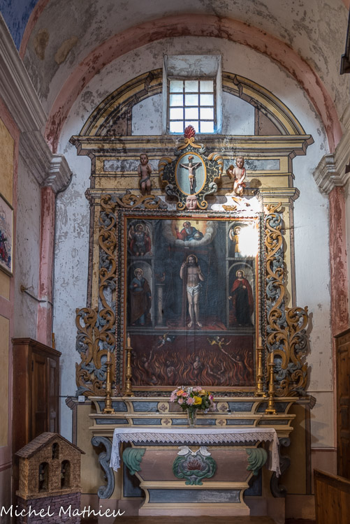 Roure. Autel des Ames du Purgatoire, dominé par une toile de Johannes Rocca (1634), composée comme un polyptyque.