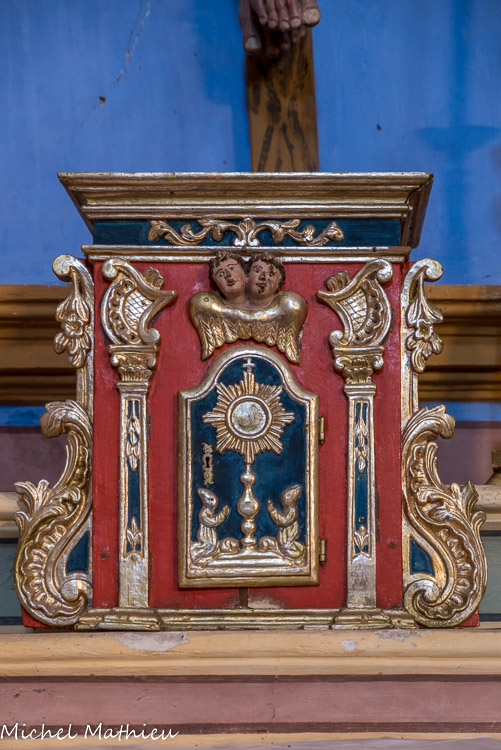 Roure. Sur la porte du tabernacle, deux pénitents sont agenouillés de part et d’autre d’un ostensoir.